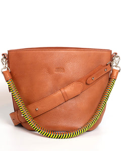 Detachable short handbraided handle in the Amazonica Mix (Orange/Yellow/Black) to wear it on the shoulder or hand.