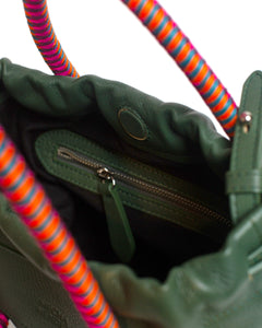This bag comes with a pair of short handles in leather + a pair of handbraided handles to interchange, in the Hypnotic Mix (Pink/Orange)