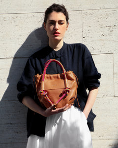 It features two interchangeable top handles: one in matching leather for a more understated look, and one hand-braided for a more expressive statement. A detachable leather crossbody strap allows for hands-free wear.